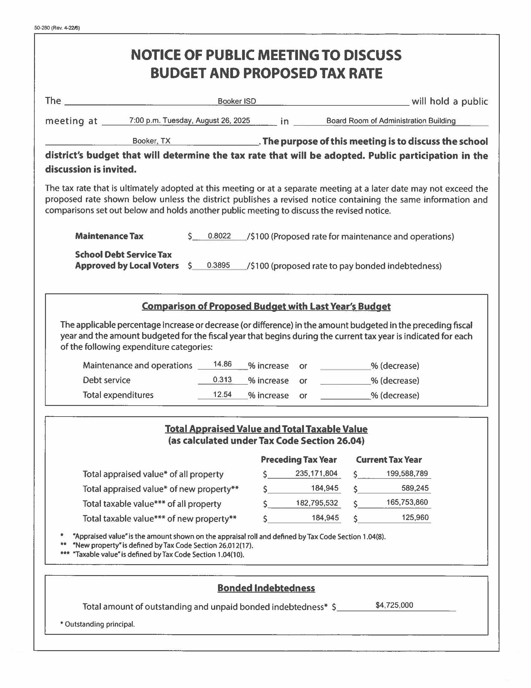 2025 Tax Rate Calculations Worksheet-Booker ISD